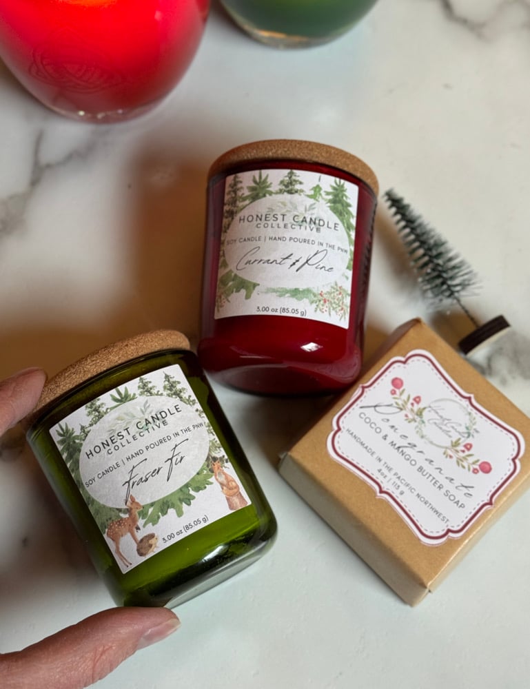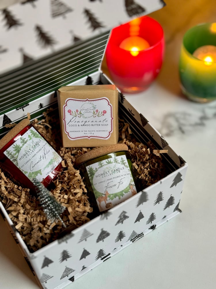 Look no further! Here’s the perfect gift, ready for giving! In this festive magnetic closure box you’ll find one mini 3 oz Fraser Fir scented soy candle, one mini 3 oz Current & Pine scented soy candle, one 4 oz Coco Mango Butter Soap in a Pomegranate scent and a tiny little bottle brush tree.